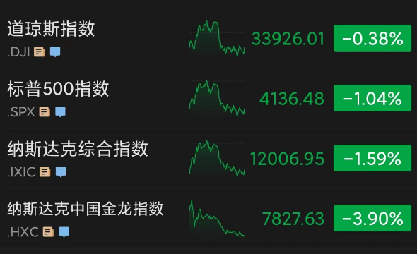 当地时间周五,美股三大指数低开后经历“过山车”行情,虽然盘中一度转涨,但午后再度回落。截至收盘,道指跌0.38%,报收33926.01点;纳指跌1.59%,收于12006.95点;标普500指数跌1.04%,报收4136.48点。